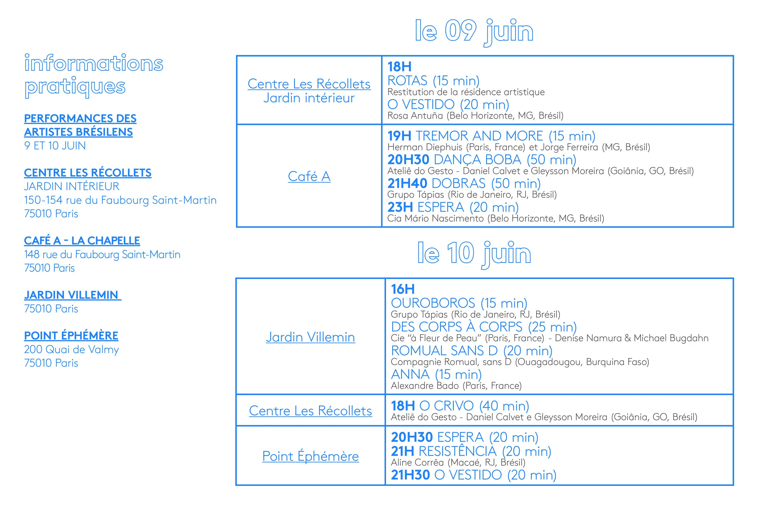 Nossa escolha recaiu sobre a França e mais particularmente sobre Paris, cidade com a qual temos diversas afinidades artísticas. Nossa proposta foi uma semana de residência compartilhada entre artistas residentes na França e no Brasil. Com o apoio do governo Brasileiro e da Prefeitura de Paris, fomos recebidos no Centre Les Récollets que nos abriu suas portas, suas janelas, seus espaços vivos e o Jardim Villemin. No final da residência, um festival foi oferecido ao público nestes diferentes espaços, bem como no Point Ephemère.